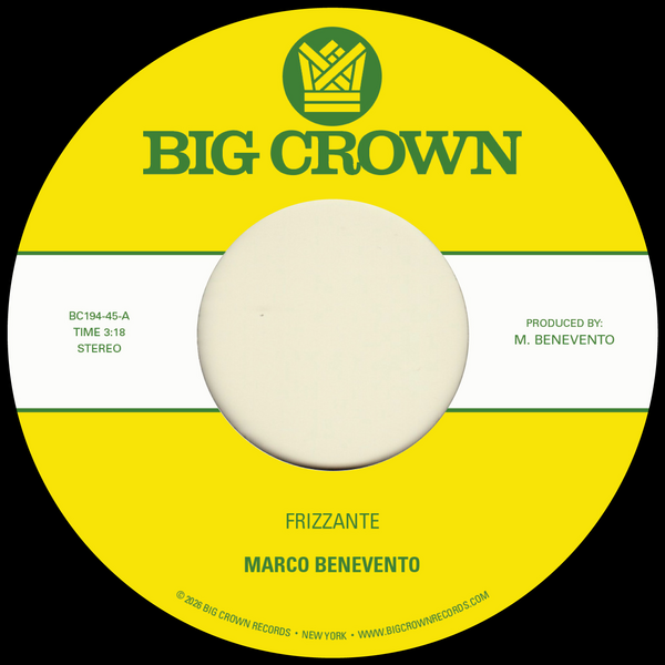 Big Crown Records is proud to announce Marco Benevento to the family with his unstoppable debut 7”. A true piano virtuoso who’s been playing since the age of seven, Marco’s career has taken him around the world many times over, earning him a deep discography and a reputation as an in-demand session player.??Big Crown co-founder and Grammy-winning producer Leon Michels first brought Marco into the fold during the recording of El Michels Affair’s Adult Themes album, and he’s been lending his talents to countless Big Crown projects ever since. Outside the label, Marco’s unmistakable touch can be heard on records by Clairo, Kevin Morby, and Freddie Gibbs, among others.??But enough about what he’s done for everyone else—this release is Marco at his finest: doing his own thing, and doing it well. The A-side, “Frizzante,” is pure celebration captured on wax, waiting for the needle to set it free. It’s a high-energy, feel-good banger that finds Marco trading melodies with himself over a relentless groove. From the first note, the infectious topline riff hooks you in, giving way to