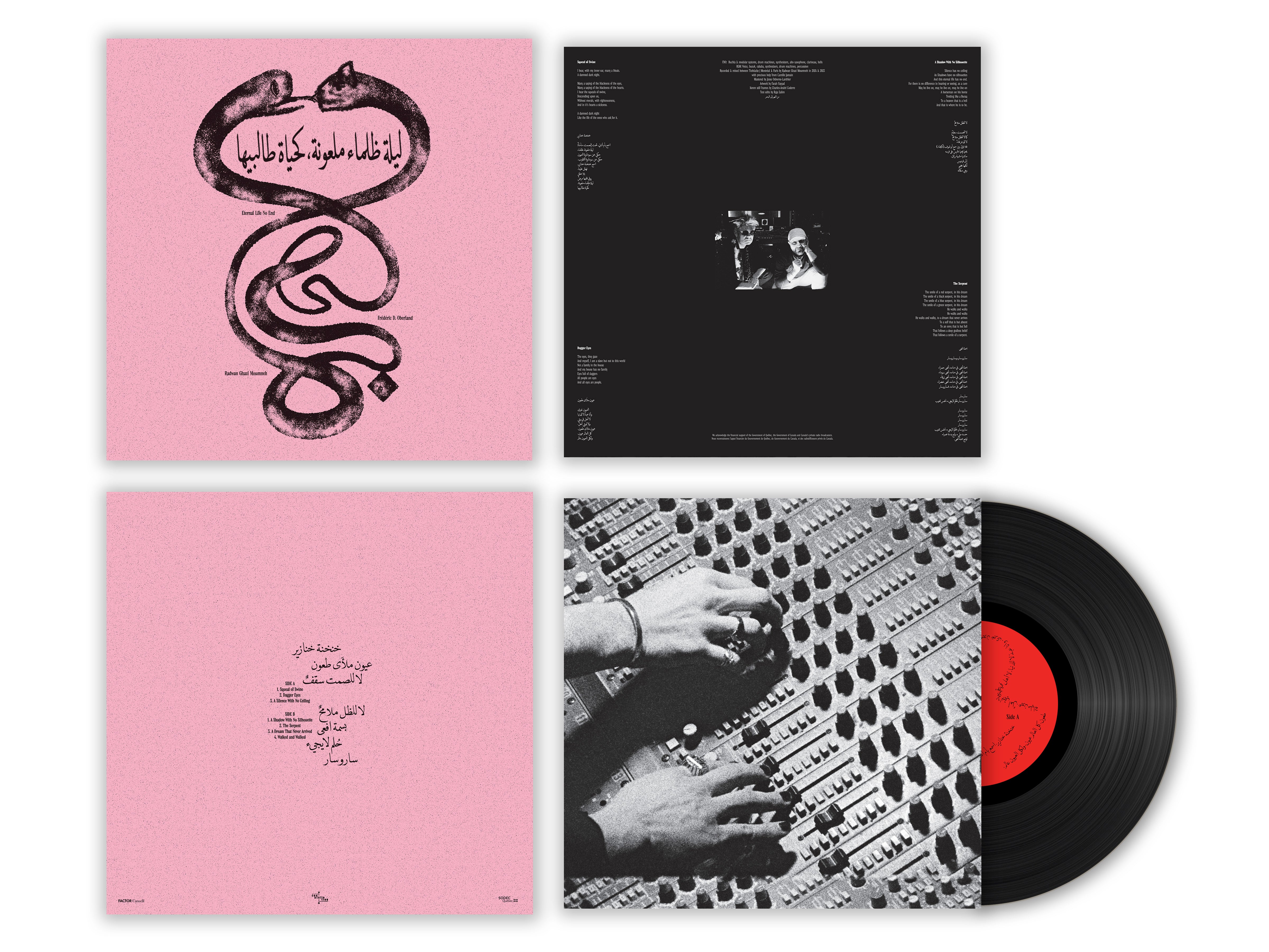 Morphing between the sensory and the suppressed, Radwan Ghazi Moumneh and Frédéric D. Oberland’s debut album summons a poetic musical proclamation of transfigured reality and social amnesia. These seven tracks evolved collaboratively over two years, beginning as a series of duets that Moumneh instigated at Montréal’s Hotel2Tango studio in summer 2023. The Arabic title of Eternal Life No End translates more literally as “A dark, cursed night, like the seekers themselves” and the album is an outcry amidst the oceans of injustice flooding the SWANA region, haunting the lives and visions of vast populations.